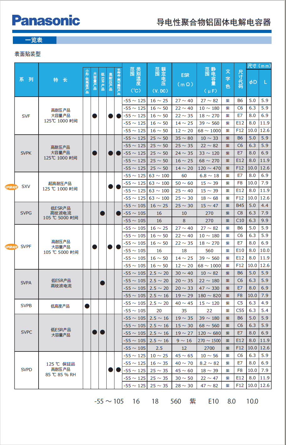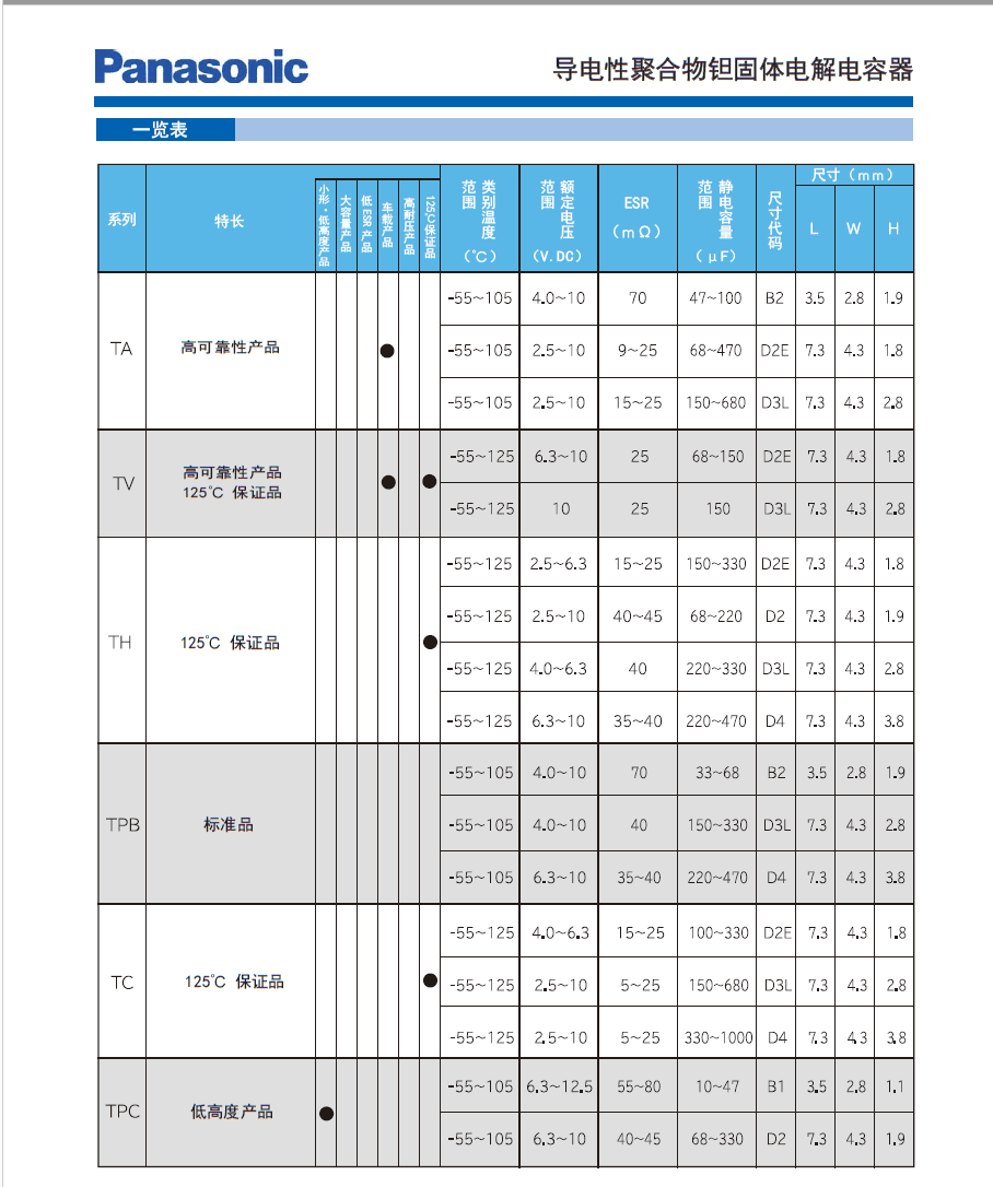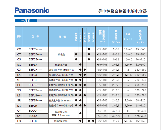 Panasonic through the use of conductive polymer materials, conductive polymer capacitor to achieve low ESR characteristics. Its great value, the characteristics of low ESR, the most fit to get rid of the noise in the wide domain, also has given it a stable temperature characteristics.